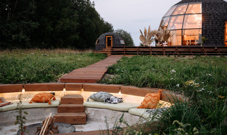 11. Вечернее теплое освещение в куполе от ретро-гирлянд, создающее домашнюю уютную атмосферу.