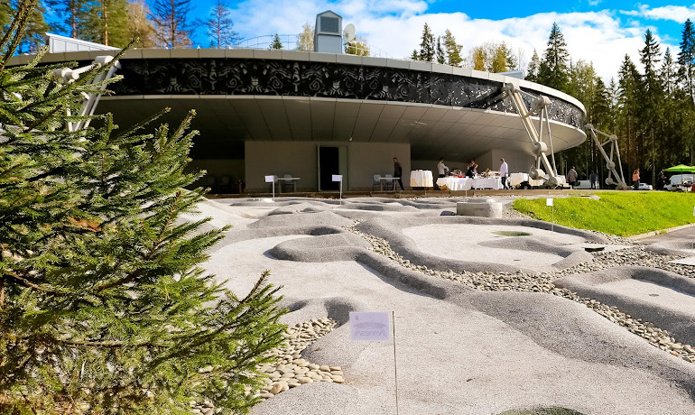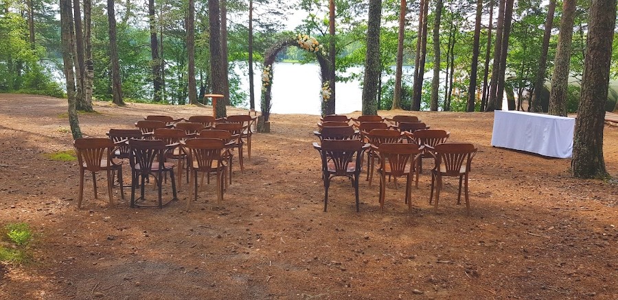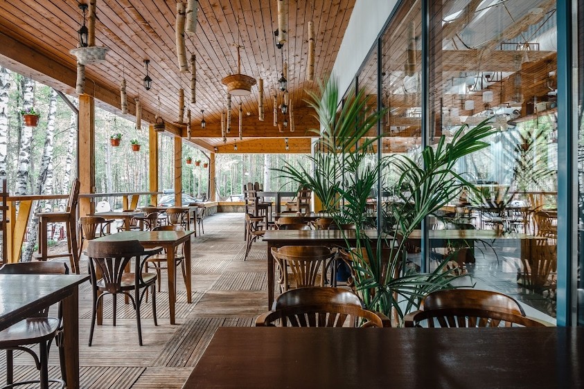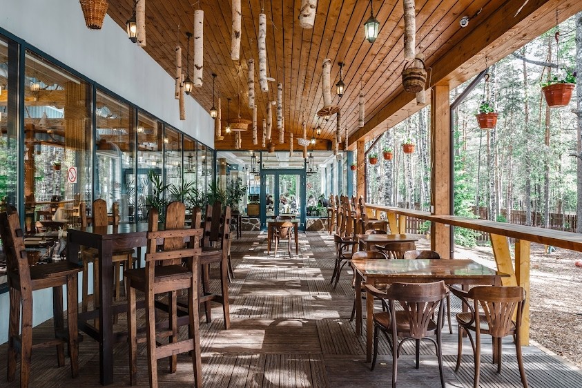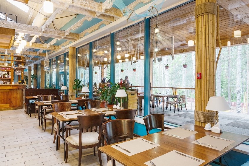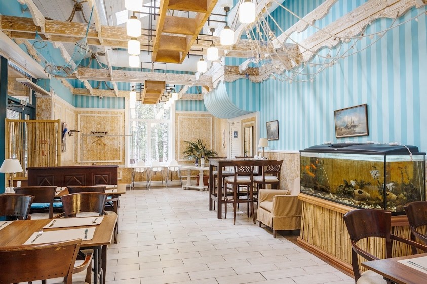 Залы выполнены в стиле портовой таверны с белеными балками под высокими потолками, панорамными окнами и деревянной мебелью, а также терраса с видом на лесное озеро.
