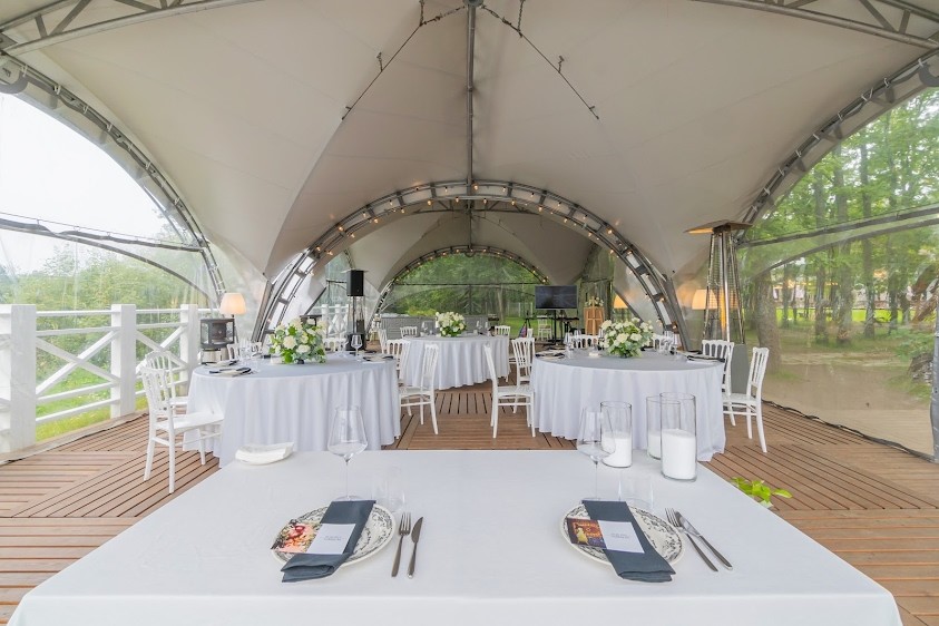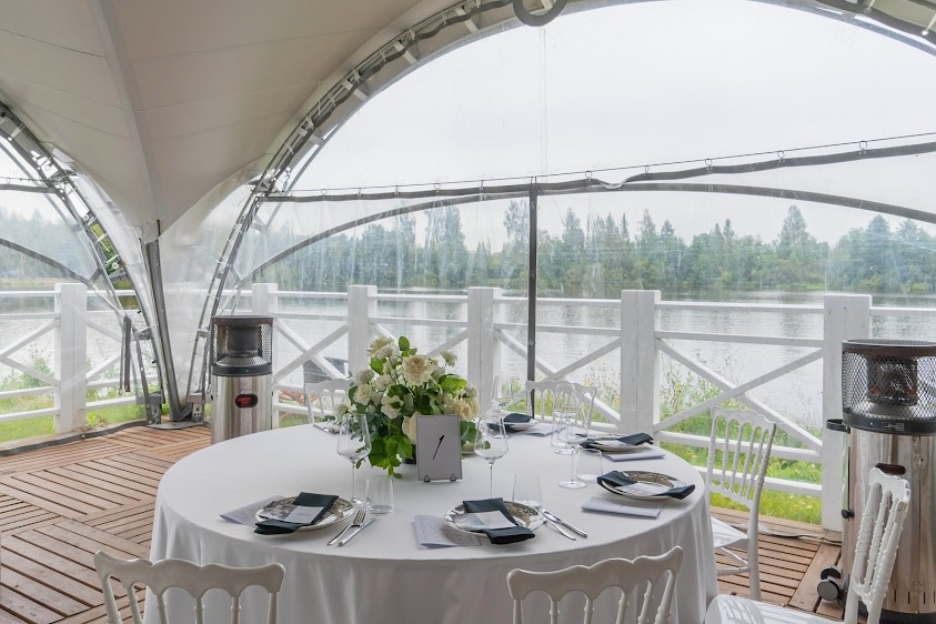 * Причал закрыт тентом от непогоды, предоставляются тепловые пушки для обогрева и пледы. Зал расположен на воде.