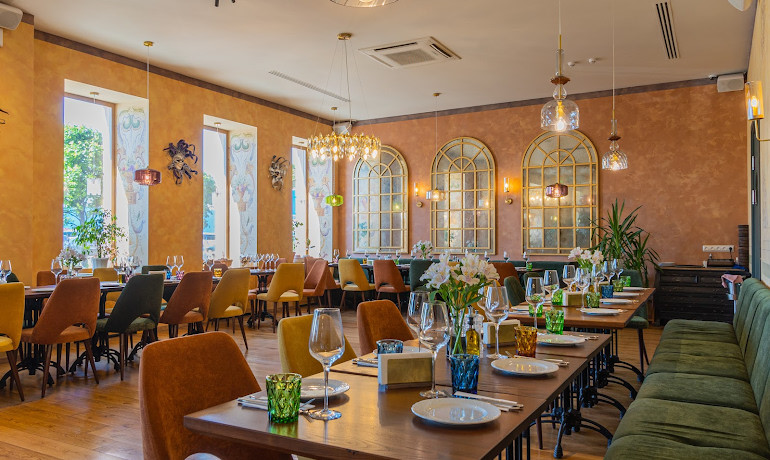 Ручная роспись, теплые цвета интерьера, аутентичный декор дают возможность провести уютный вечер в кругу любимых. Открытое и большое пространство ресторана делает удобным организацию банкетов и корпоративов, на которые вам предложат специальное банкетное меню.
