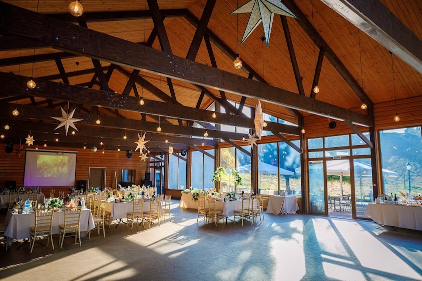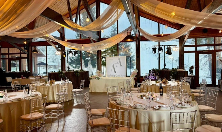 Зал с панорамным видом на склон. Максимальная посадка в формате банкет - 200 Гостей. Прямоугольная форма зала, высокий потолок, уютный интерьер в стиле шале.