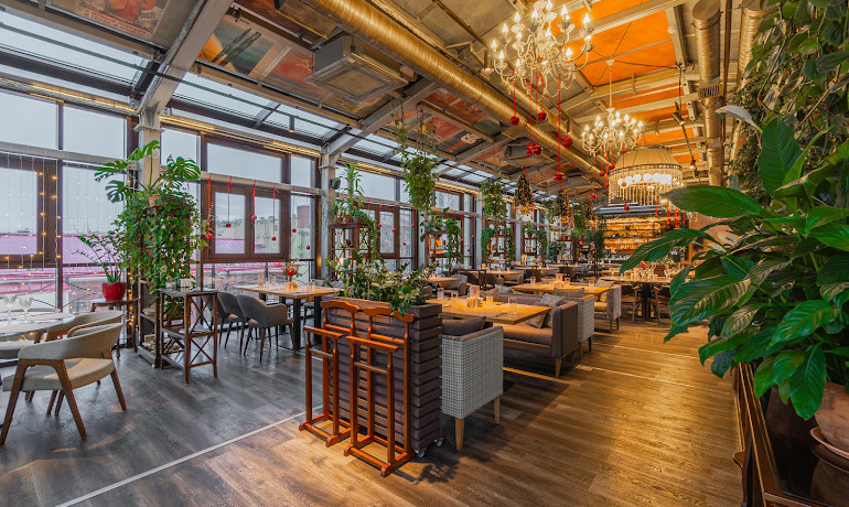 Ресторан располагается на 5 этаже в историческом здании на набережной реки Мойки в пешей доступности от главных достопримечательностей Петербурга.