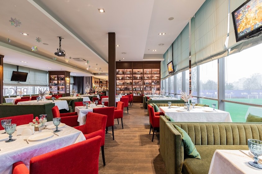 Ресторан "Трибуна" разделен на два симметричных просторных зала, в одном из залов размещена открытая кухня, в другом — детская комната. Залы оборудованы 8-ю плазменными панелями и большим проектором в одном из них. Также ресторан оснащен профессиональным звуковым оборудованием: акустической системой, микшерным пультом и микрофонами.